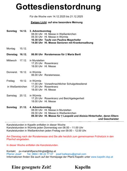 Gottesdienstordnung 14.12.2025 - 21.12.2025 Gottesdienstordnung 14.12.2025 - 21.12.2025 mehr: Gottesdienstordnung 14.12.2025 - 21.12.2025
